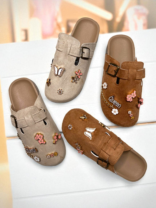 Infinite StylesStep into comfort with a touch of charm in the Embellished Comfort Clogs. Designed with a soft suede finish, jeweled floral and butterfly details, ...