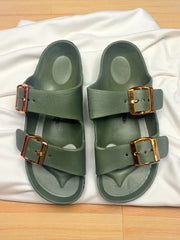 The Birkenstock Dual-Strap Sandals – Gold Buckle Edition bring classic comfort with a refined touch. Featuring adjustable straps, a contoured footbed, and striking gold buckle details, they blend everyday ease with elevated style.