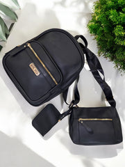 Step out in style and functionality with this versatile black 3-piece bag set. Featuring a sleek backpack for your daily essentials, a chic shoulder bag for easy access, and a compact pouch for those smaller must-haves, this set brings elegance and practicality together. The gold accents add a touch of luxury, making it perfect for both casual outings and professional settings. Redefine your accessory game with this all-in-one solution designed to meet your every need.
