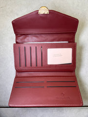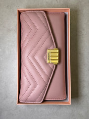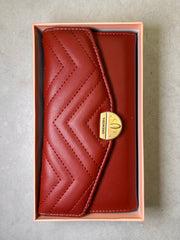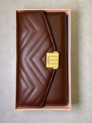 Add a pop of color and sophistication to your accessory lineup with the Grenobil Chevron Quilted Wallet in Burnt Orange. This wallet features a striking chevron quilted pattern that exudes elegance and style, paired with a secure gold-tone clasp for a touch of luxury. Crafted with meticulous attention to detail, it offers multiple compartments to keep your cards, cash, and essentials organized. Its compact design makes it easy to carry solo or slip into your handbag, ensuring you stay stylishly organized wherever you go. The rich burnt orange color complements any outfit, making it a must-have statement piece.