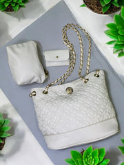 Indulge in timeless elegance with the Grenobil Chocolate Quilted Tote Set. Crafted in a luxurious deep chocolate hue, this set includes a spacious quilted tote with sophisticated gold chain straps, an elegant coin pouch with a secure snap closure, and a versatile zippered accessory bag for your essentials. The tote boasts ample storage for your daily necessities while exuding a refined charm. Perfect for work, shopping, or casual outings, this set combines functionality with impeccable style.