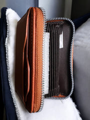 Crafted for the modern minimalist, the Grenobil Classic Zip Wallet in coffee brown delivers both function and style. Its textured faux leather finish adds a touch of sophistication, while the secure full zip-around closure ensures your cards and cash stay in place. The front slot detail stamped with the Grenobil label adds a signature finish. Compact yet spacious enough for your essentials, this wallet is perfect for everyday use or travel.