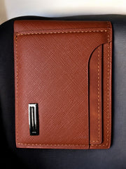 Sleek and understated, this chestnut brown bi-fold wallet brings everyday practicality to a new level. Designed with a rich textured finish, it features convenient exterior card slots and a clean silhouette enhanced by minimal hardware detailing. Its slim profile makes it ideal for front or back pocket use, offering style without the bulk. Perfect for the modern minimalist who values function with flair.
