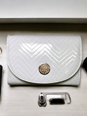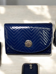 Elevate your accessory game with the Grenobil 3-Piece Chevron Glossy Wallet Set. Featuring a striking chevron pattern with a high-gloss finish, this set brings sophistication and function together. Each piece is designed for your convenience, including a main wallet with a secure flap closure, a wristlet pouch, a mini zip wallet, and a matching strap. Perfect for daily use or special occasions, this set ensures you stay organized in style. The chic golden Grenobil emblem adds a luxurious touch to this coordinated set.