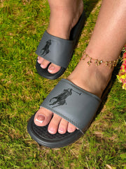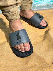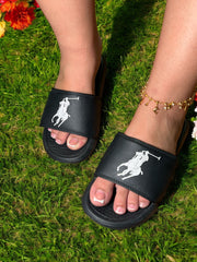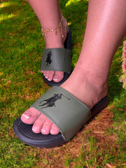 Slide into sleek style with these Ralph slides, featuring a bold polo rider logo against a rich olive green. The soft, cushioned footbed ensures all-day comfort, while the durable strap keeps your feet secure whether you’re lounging by the pool or strolling through the city. Perfect for effortless style with a hint of sporty charm, these slides add a refined touch to any casual look.
